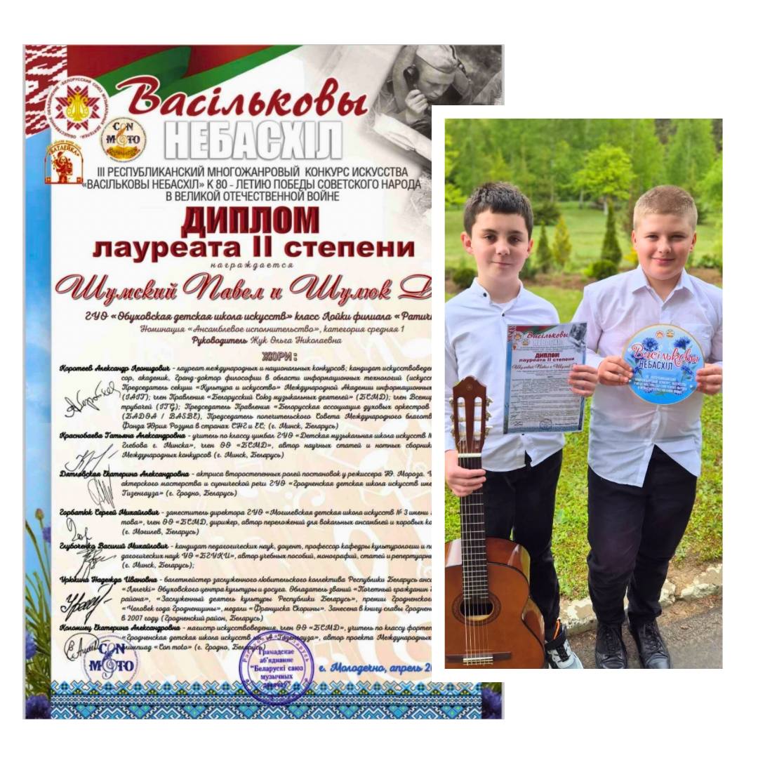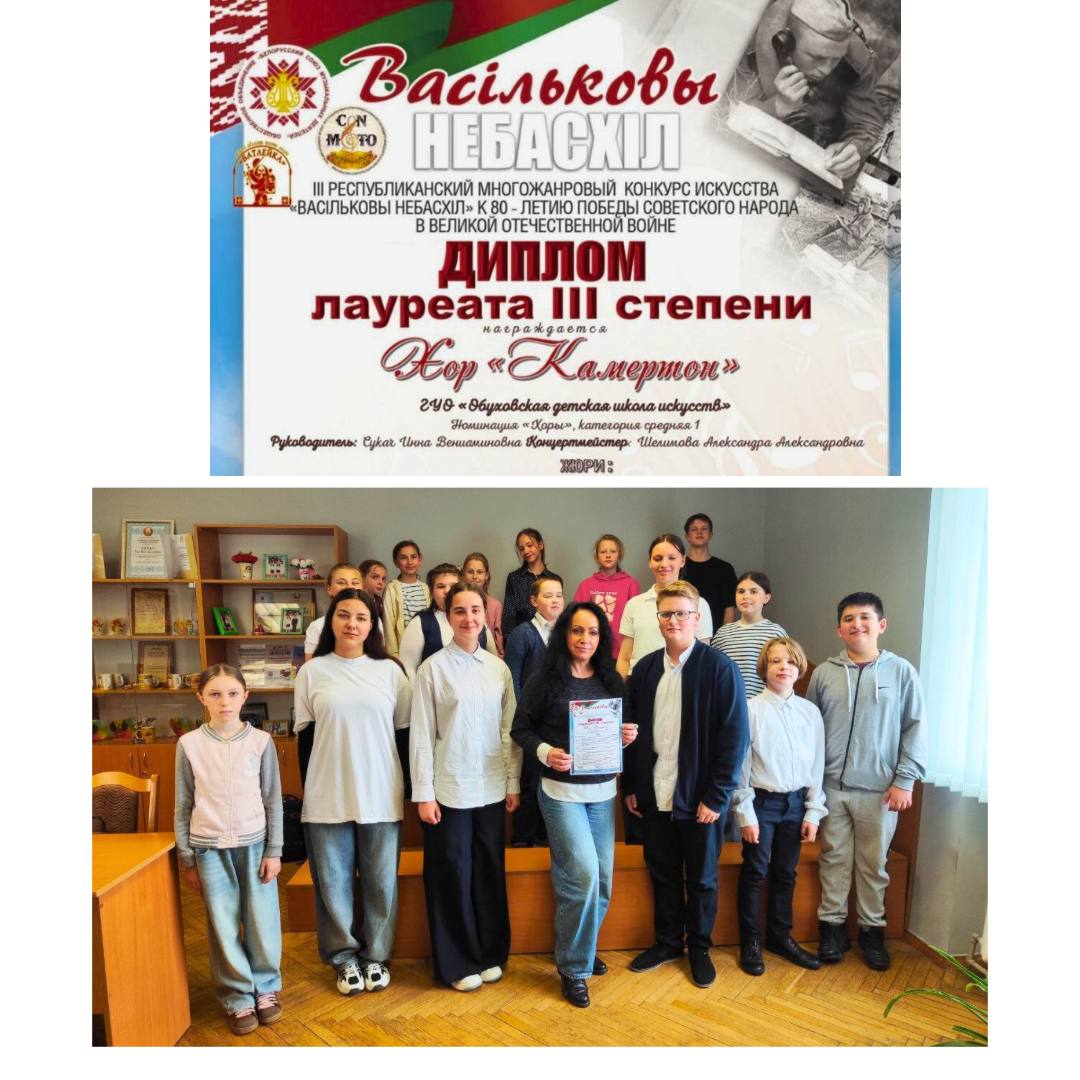 В апреле, прошел III РЕСПУБЛИКАНСКИЙ МНОГОЖАНРОВЫЙ КОНКУРС ИСКУССТВА «ВАСIЛЬКОВЫ НЕБАСХIЛ» приуроченный к 80-летию ПОБЕДЫ СОВЕТСКОГО НАРОДА В ВЕЛИКОЙ ОТЧЕСТВЕННОЙ ВОЙНЕ, в котором приняли участие учащиеся хорового и народного отделения: