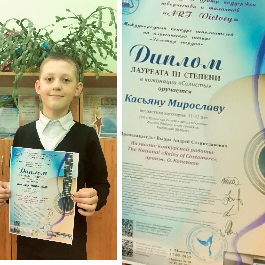 Учащийся по классу гитары (филиал Ратичи, класс Сопоцкин) КАСЬЯН Мирослав принял участие в Международном конкурсе исполнителей на классической гитаре «Золотая струна» и завоевал звание Лауреата IIІ степени - учитель А.С.ВЫДРА.