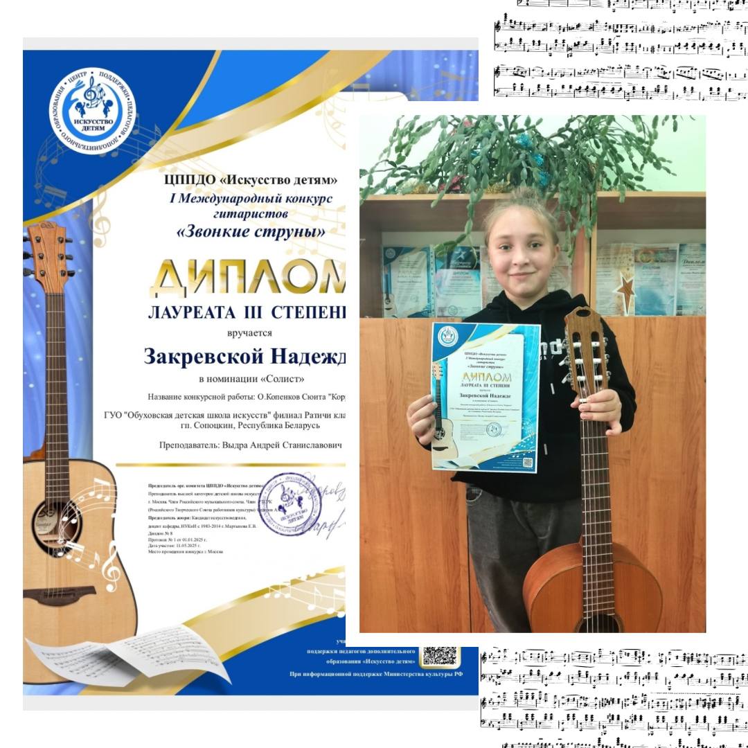 В мае, учащаяся по классу гитары ЗАКРЕВСКАЯ Надежда (филиал Ратичи, класс Сопоцкин), приняла участие в I Международном конкурсе гитаристов «Звонкие струны» и была награждена дипломом лауреата III степени-учитель А.С. ВЫДРА.