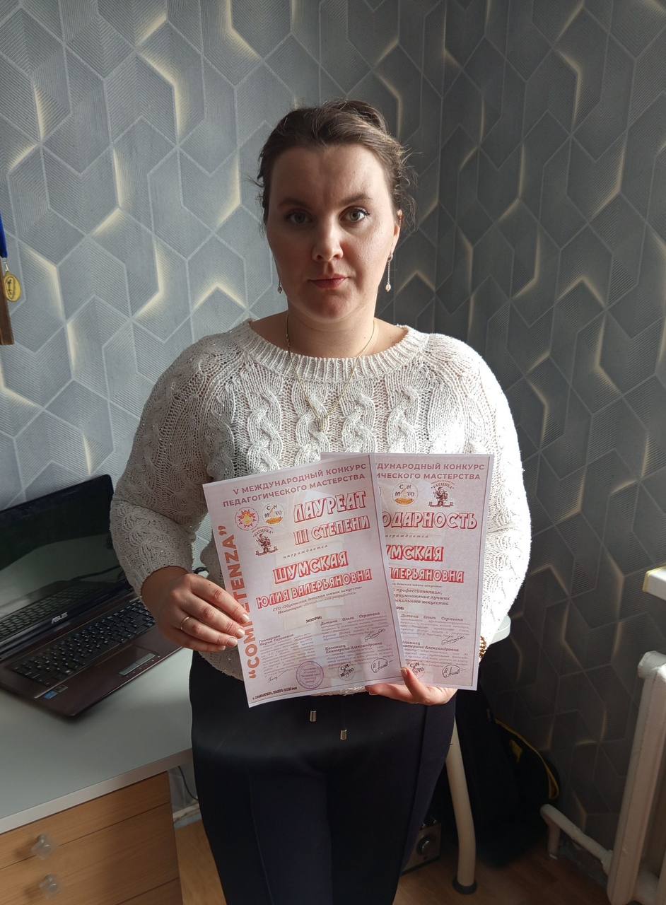 в ноябре состоялся V Международный дистанционный конкурс педагогического мастерства "Competenza" в котором приняла участие учитель нашей школы класса Лойки филиала Ратичи Шумская Ю.В. По результатам конкурса учитель завоевала диплом Лауреата 3 степени.